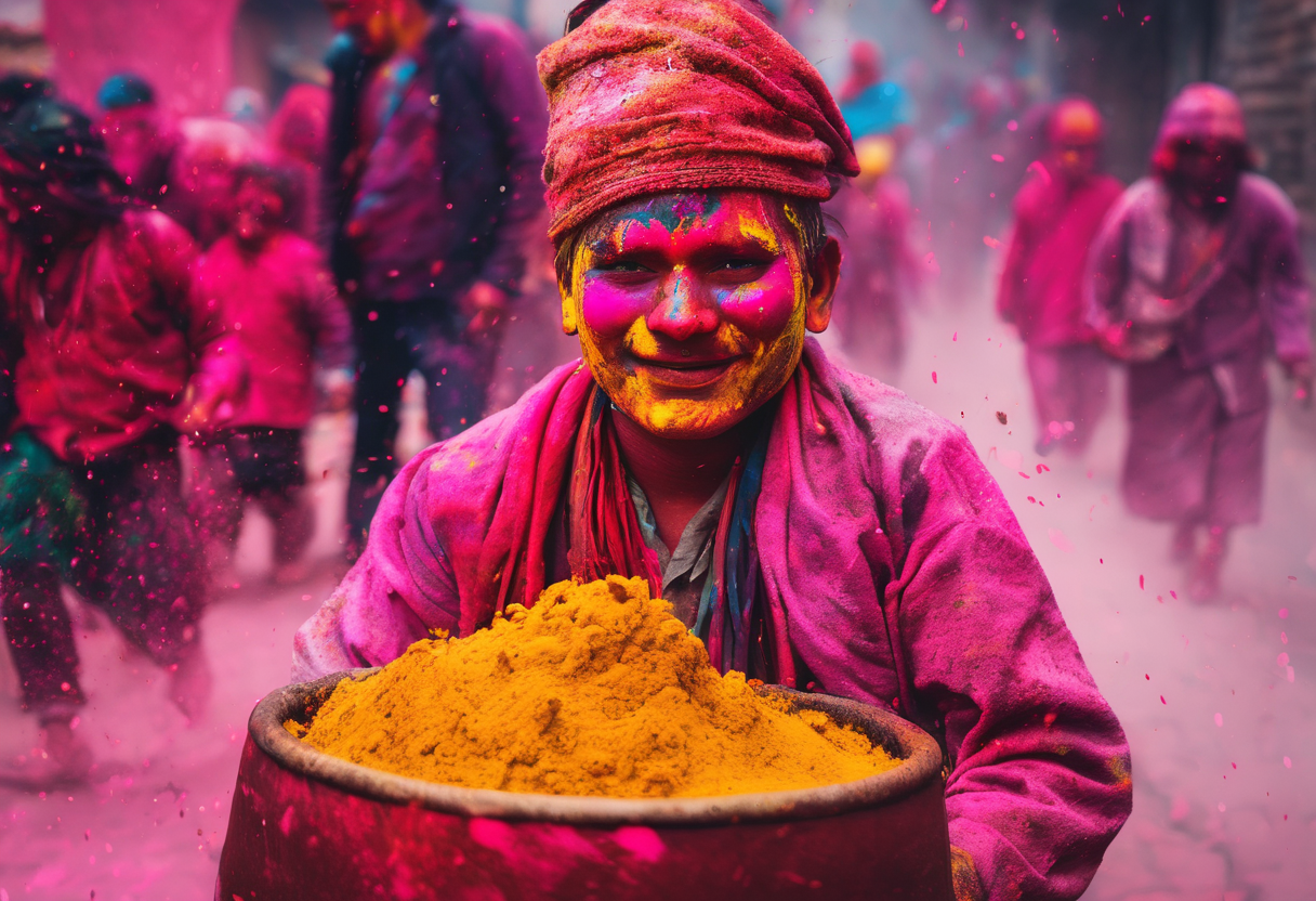 Holi, also known as the Festival of Colors, is one of the most popular and lively festivals celebrated in Nepal, particularly in Kathmandu. This vibrant festival is a celebration of the victory of good over evil and the arrival of spring. The streets of Kathmandu are filled with a joyful atmosphere and a kaleidoscope of colors as people gather to partake in the traditional customs and rituals of Holi.One of the most significant traditions of Holi is the lighting of the Holika bonfire the night before the main festival. This ritual symbolizes the triumph of good over evil, as the bonfire represents the burning of the demon Holika. The following day, people gather in the streets throwing colored powder and water at each other, in a tradition known as “playing Holi”. This joyful and playful act is believed to bring good luck and prosperity. Another important tradition during Holi is the preparation and consumption of special delicacies such as gujiya, a sweet dumpling filled with khoya, nuts, and dried fruits. Families and friends also come together to celebrate with traditional dances, music and singing during Holi.